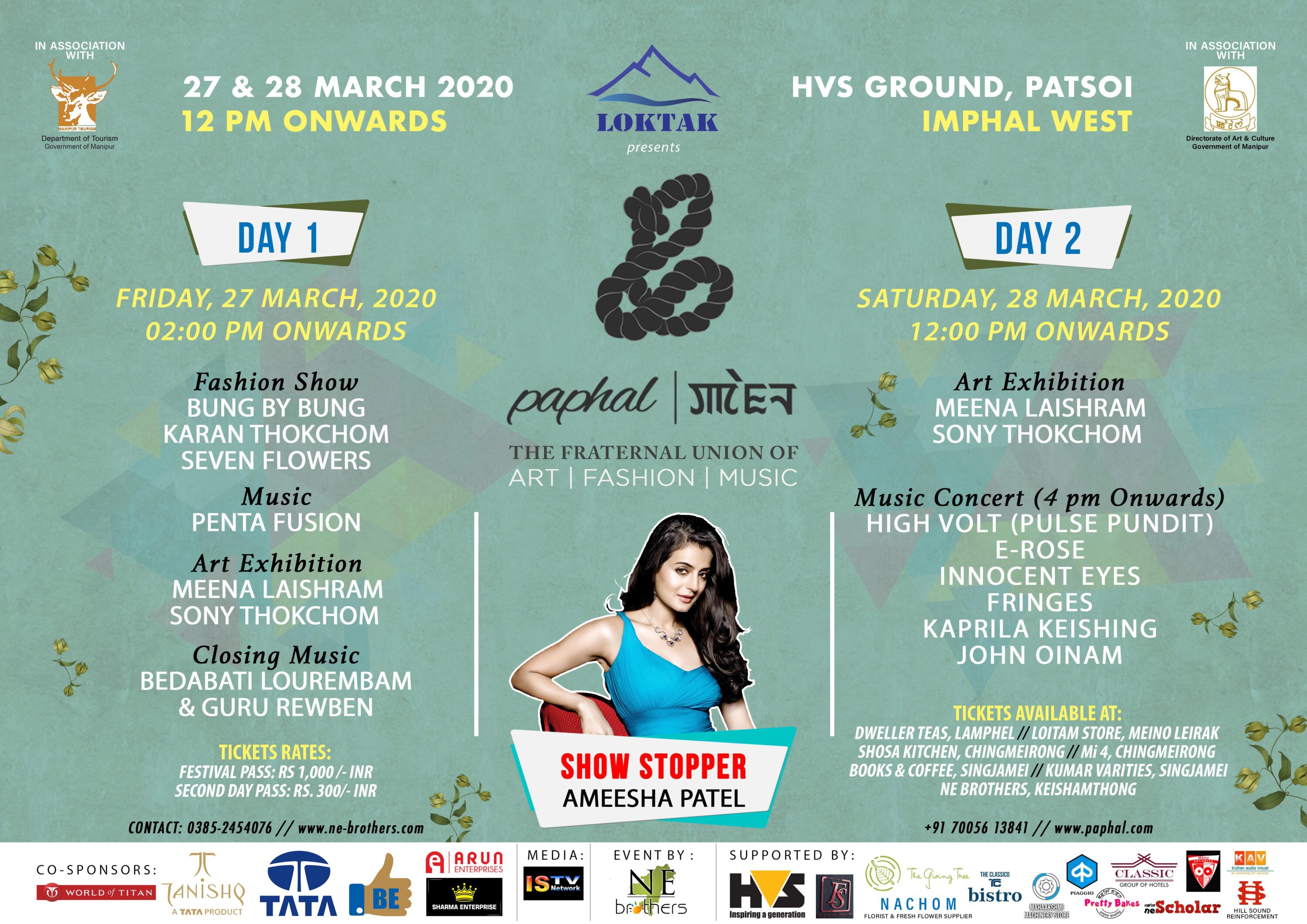 Paphal NE BROTHERS 4 years ago Paphal The Fraternal Union of Art/Fashion/Music for 2 days from 27th March 2020 to 28 March 2020 at HVS Ground, Patsoi, Imphal Event managed by NE Brothers Entertainments Pvt Ltd